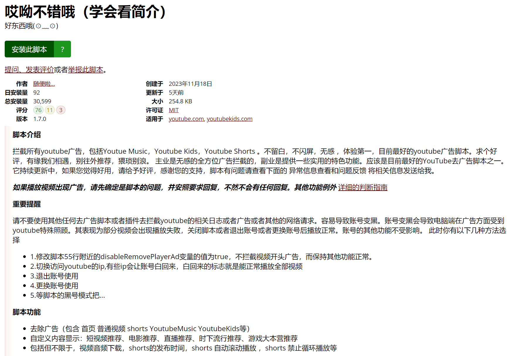 这款脚本的作者强烈建议,不要与 AdBlock 等其他去广告插件同时使用,不同去广告工具混用,极易被 YouTube 判定为账号异常,常见表现为视频无法播放、播放卡顿等问题。如果使用中遇到各类异常,可先关闭其他去广告扩展,单独使用该脚本即可恢复正常。