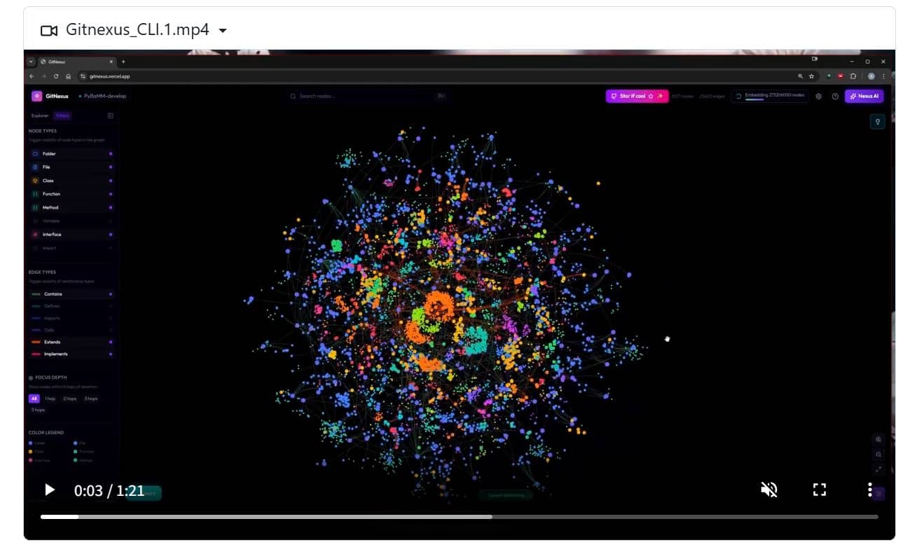 针对大规模代码库的解析效率问题,GitNexus 引入 Web Workers 多线程并行解析机制,即便是包含上万文件的 Monorepo 项目,也能避免页面卡顿或解析超时,这一点相较于传统单线程解析工具具备显著优势。而在可视化层面,其基于 D3.js 构建的交互式知识图谱,让开发者能够直观遍历代码调用链、依赖集群,快速定位模块间的关联关系,解决了大型项目中“代码链路溯源难”的痛点。视频地址:点击传送门。