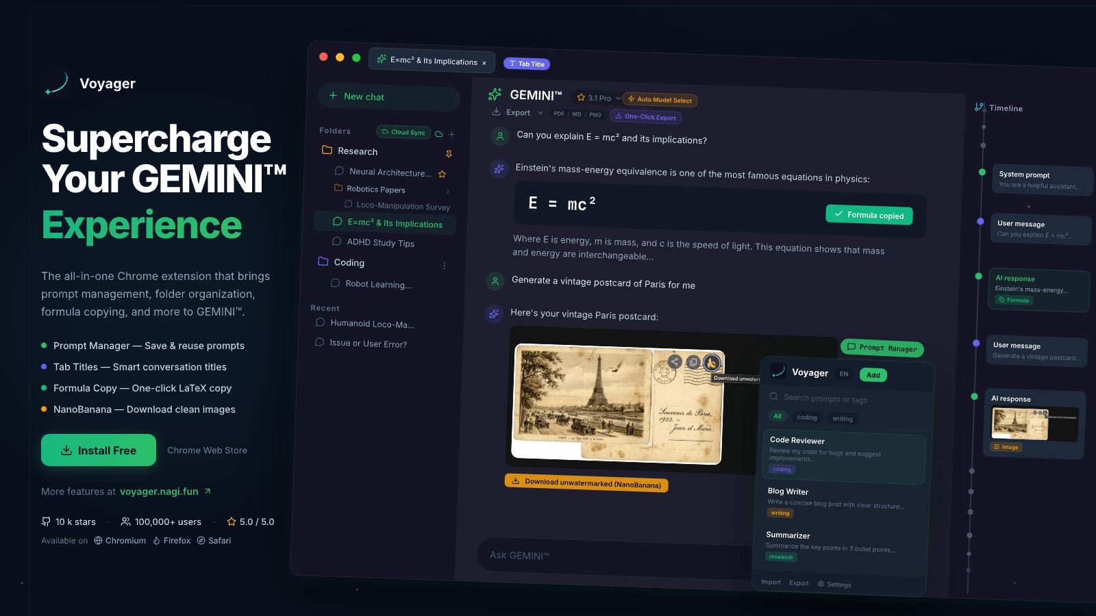 作为一款 GitHub 开源免费的高性价比辅助工具,Voyager 插件主打“轻量化、全功能、零门槛”,完美适配新手对实用工具的核心需求,无需专业技术基础,安装后即可直接使用,彻底解决新手使用 Gemini 时“聊天无分类、关键信息难查找、提示词反复输入”的难题,全程无广告、无付费捆绑,新手可放心使用。